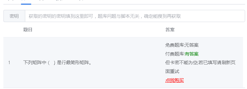 将你购买的密钥填上上面的密钥框,你的搜题基本就可以成功了(注意,大部分应用题的答案是没有的,这个主要还是应付选填题),这个搜题功能在你使用网页版的学习通进行考试时等页面都可以使用。