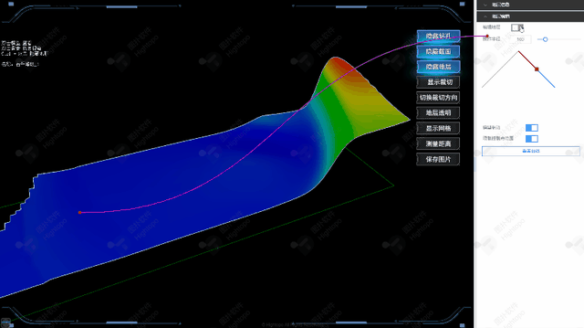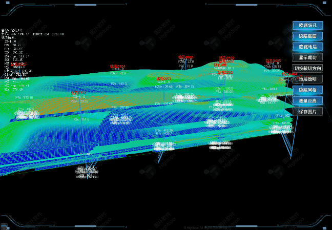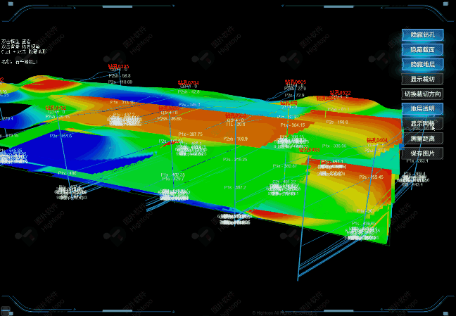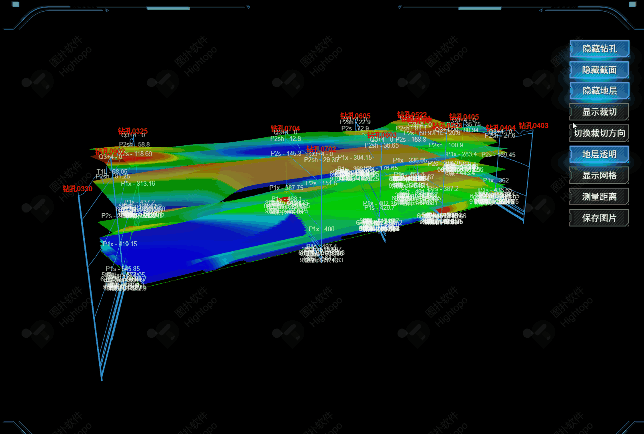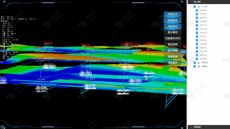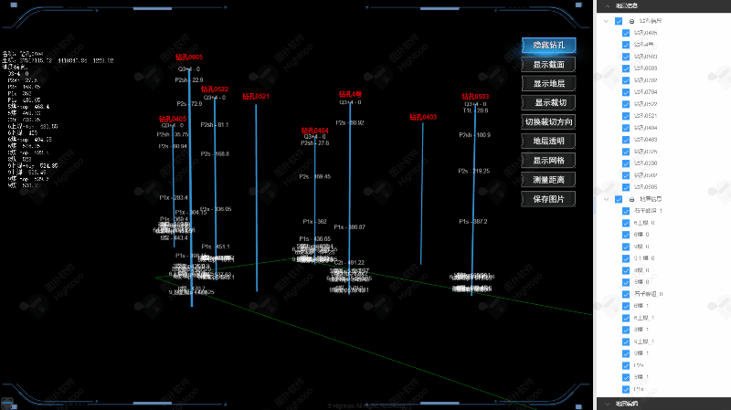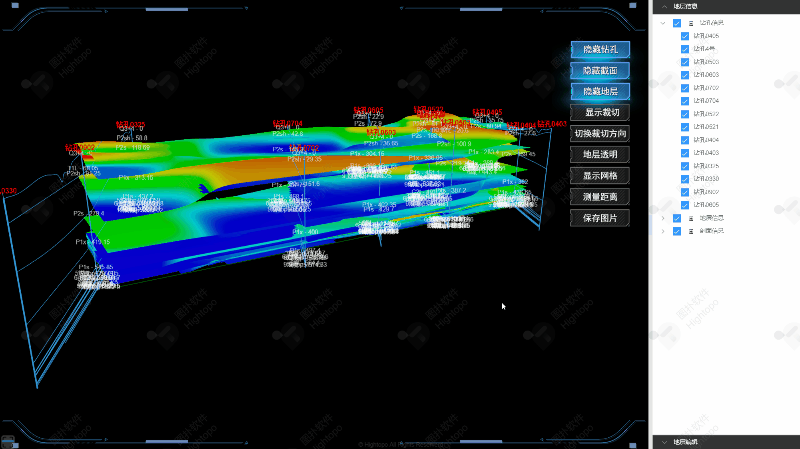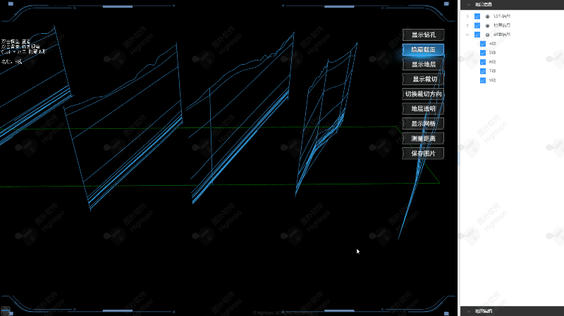 钻孔信息可以在左侧看到总览,同时用户也可以在三维场景中直观的看到具体地层的位置。用户可以按任意方向裁切三维地层,观察地层的变化,保存裁切面图片。