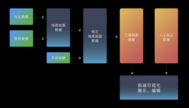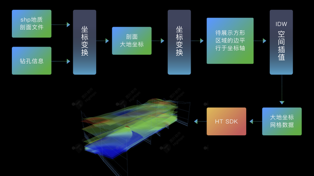 通过钻孔数据和各种物探手段,我们可以获得矿区地层的多个断面信息。根据断面信息,利用插值算法(反距离插值 IDW 或者克里金插值),获得整个矿区的地层三维网格数据。利用图扑软件 Web 可视化引擎,将网格数据呈现到 Web 端,加强地质直观展示方式的空间拓展,挖掘隐藏的地质信息内容,提升数据应用价值。