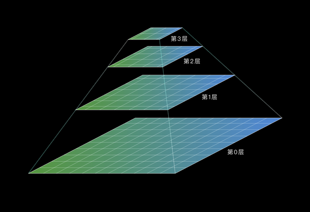 为了满足前端页面各种展示需求,服务器端采用金字塔式数据结构,按照不同的网格间距生成多个分辨率的三维网格信息。前端根据展示的分辨率需求和展示的区域,请求对应的网格信息。对于超出屏幕范围或者不可见的部分加以隐藏。