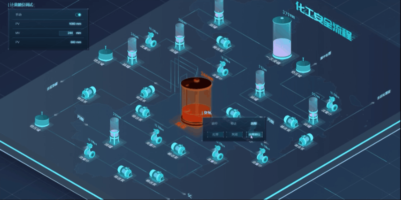 监控平台对集成重点作业区域、装置位置分布及投入产出、产品产量、装置平稳率、装置负荷率等,搭载的智能感知设备,实时采集温度、压力、液位、有毒有害监测等关键参数。同时 2.5D 组态界面能清晰辨别工艺的流程的分布以及各个子流程的工艺走向,用户可根据设备甚至零部件的位置、颜色变化及时发现问题。实现对化工设备和生产装置运作状态多层面的可视化监控。