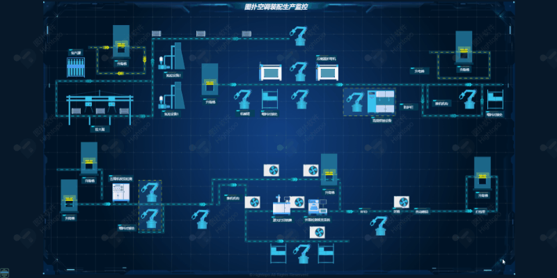 以二维组态图方式搭建的空调装配生产线,界面中可对用户所关注的产能信息、设备运行关键指标进行监测展示。通过对接后台实时数据进行实时更新,展示对运维管控数据展示所做出的贡献统计。