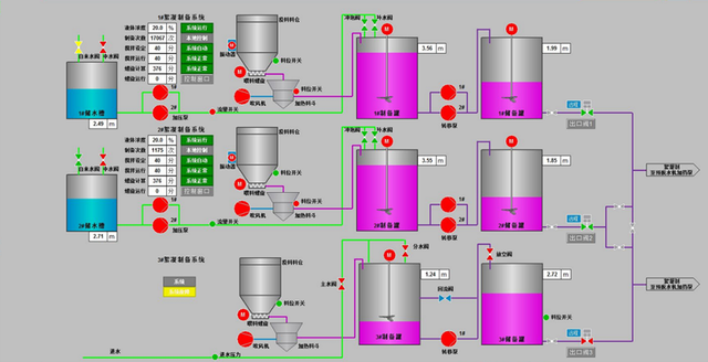 全新的 2D 组态界面中,通过图扑软件 HT 引擎技术,实现组态图元流畅的动态效果开发。本系统中展示了 3 条絮凝剂制备产线流程,采用固定面板的方式展示制备系统的液体浓度、制备次数、搅拌模式设定、系统运行状态等实时数据;以及关键设备制备罐、储备罐液位,主要阀门数据等。
