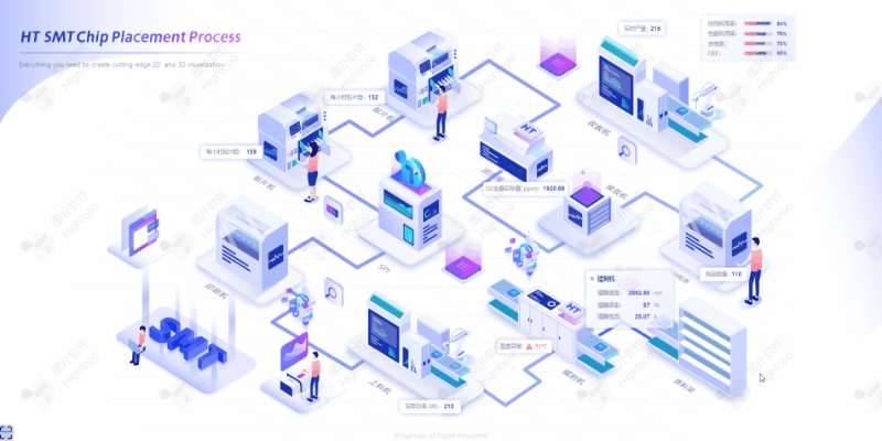 SMT 车间作为高度自动化的车间,可借助智能设备、FIRD、网络等先进技术,搭配图扑可视化技术,让传统的信息制造业实现数据统一管理运维,赋能行业向智能化、绿色化发展。