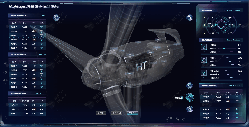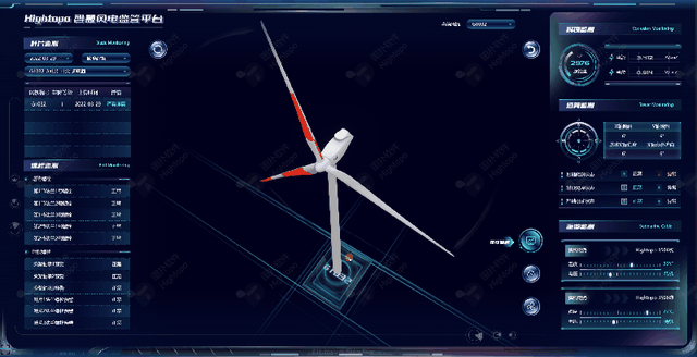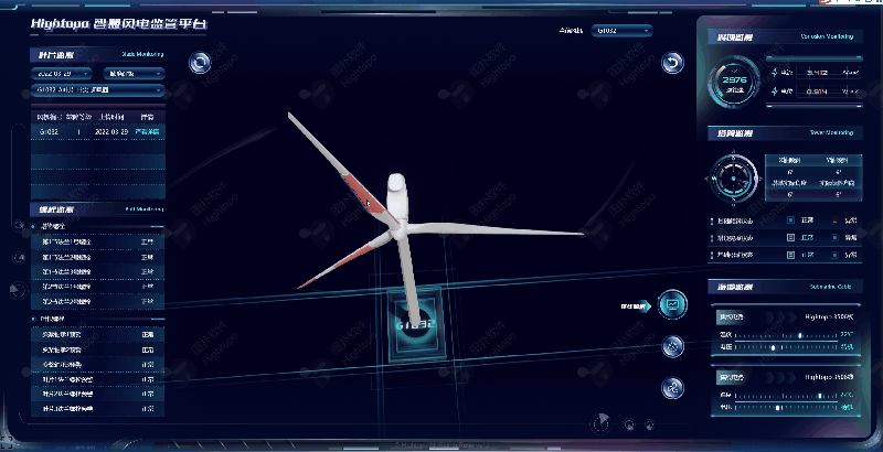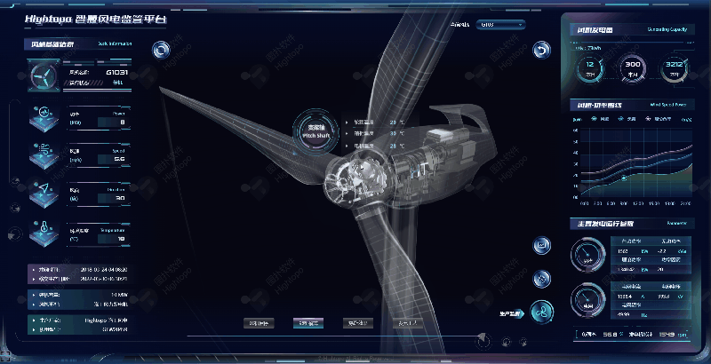 图扑软件利用自主研发的 HT for Web 产品,搭建出了风机系统内在发电工艺的三维模型。1:1 还原风机的外部结构以及主要部件,并通过对接物理传感器的实时数据,还原风机各个部件的关键数据,构建风电场机组全面的生产感知力,实现环境、电量、性能可视化。