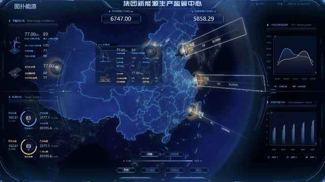 通过图扑软件可视化实现全国电力情况的数字孪生,统计全国范围内海上风电场和山区风电场的有功功率、日发电量总数,实现生产监管、决策支持、报表查看。