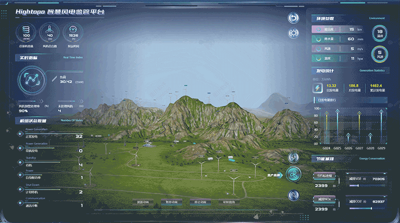 可再生能源装机量的迅速提升也为电力系统的稳定运行带来巨大压力。由于风电、光伏的输出功率受气象情况和运行环境影响较大,致使电站输出功率难以预测,亟需智慧电力一体化管控平台进行监管,以保障电网的平稳运行。运用图扑软件自主研发引擎 HT for Web,构建可交互式的 Web 三维电力场景,实现全国新能源设施的有效管控,保障电力系统的运行通畅。