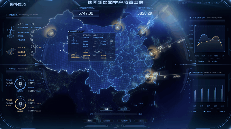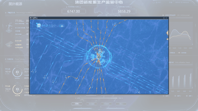 将电网数据的中控平台接入可视化系统,实现新能源开发、运送、消耗数据的实时驱动,便于运维掌握一手资料。将能源政策分析解读、区域能源资源综合分析评估、发展规划编制、年度计划编制在 Hightopo 可视化系统中展示,以规划后续新能源电力设施的建设。