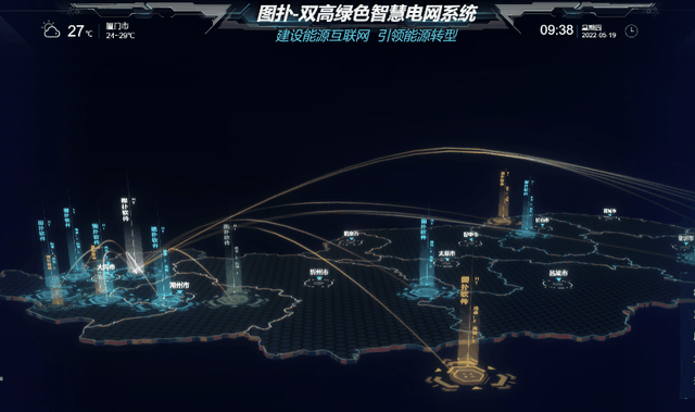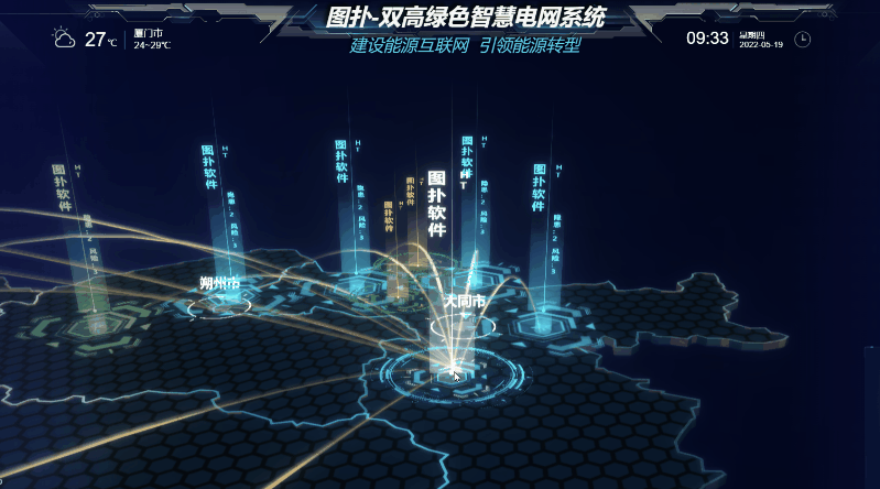 图扑软件双高绿色智慧电网系统以首个国内最高电压等级特高压交流示范工程为依据,以动态流光线条展示电流的输送。它是我国自主研发、设计和建设的具有自主知识产权的 1000 千伏交流输变电工程——晋东南—南阳—荆门特高压交流试验示范工程,全长 640 公里。