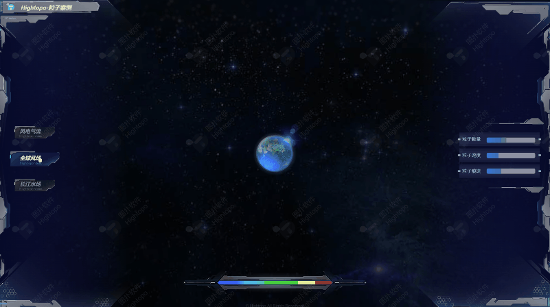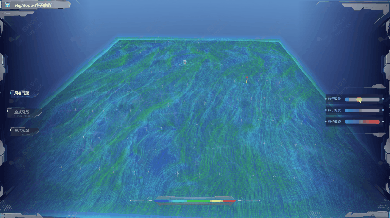对于需要在一个面上展示的流体场,比如风场,水流场,压力场等,需要以动态的方式呈现,可以使用图扑粒子插件实现。在图扑软件可视化系统的主场景内可查看风电气流、全球风场、长江水场的粒子流动情况,右侧按钮可自由调节粒子数量、粒子速度、粒子痕迹,自定义粒子的行为。