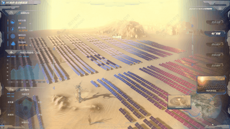 利用自主研发引擎 HT for Web 将 2D 和 3D 无缝融合,在 2D 面板查看新能源陆地总装机容量、海上总装机容量;接入区域公司数量、风场数量、风机总数量、总装机容量、逆变器数量、光伏电站数量实现有效管控。