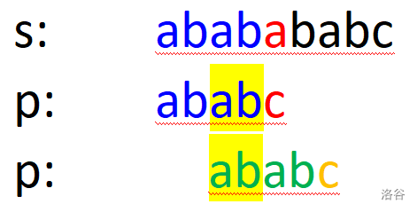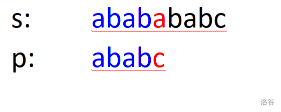 你从每一个地方出发,逐一对比(见下图),就当你快要找到共同点时,却不可避免地发现了不同(标红部分),失望发现 \(p_i \ne s_j\)。