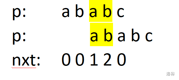 while(j && p[i] != p[j + 1]) j = nxt[j]; // 为自己,也为他人,退