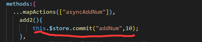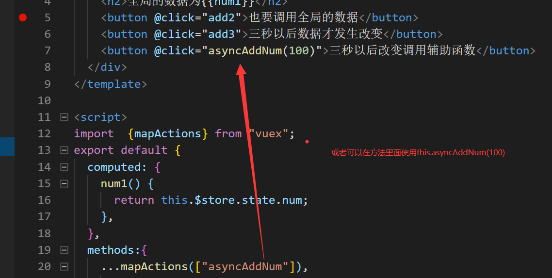 放法二:使用辅助函数mapActions 引入, 解析 ,调用,这个解析是在methods这个里面的 这个解析意思是只要异步步方法里面的一个要addNum()这个方法