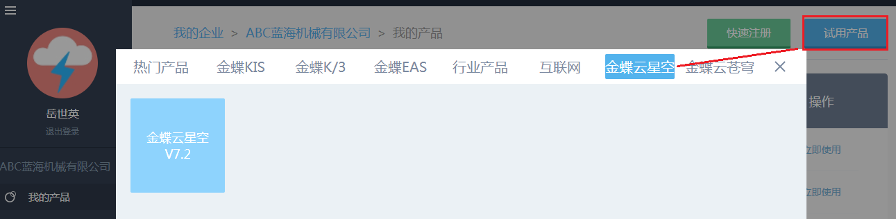 2、 点击【试用产品】,选择需要试用的产品及其版本,如图: