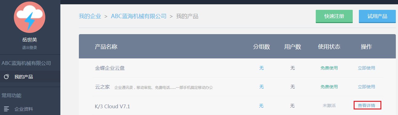 1、 登录金蝶云平台[https://cloud.kingdee.com/qy/home],点击企业名称;