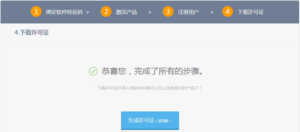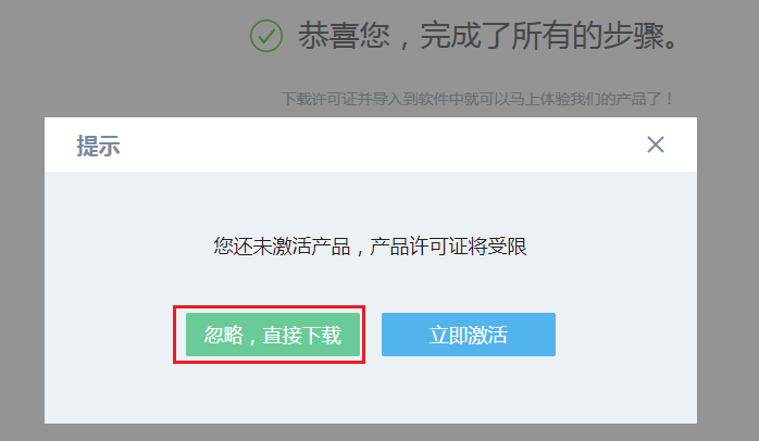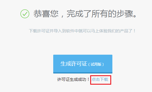 点击【生成许可证】,选择【忽略,直接下载】,许可生成成功后,选择【点击下载】进行许可文件的下载;
