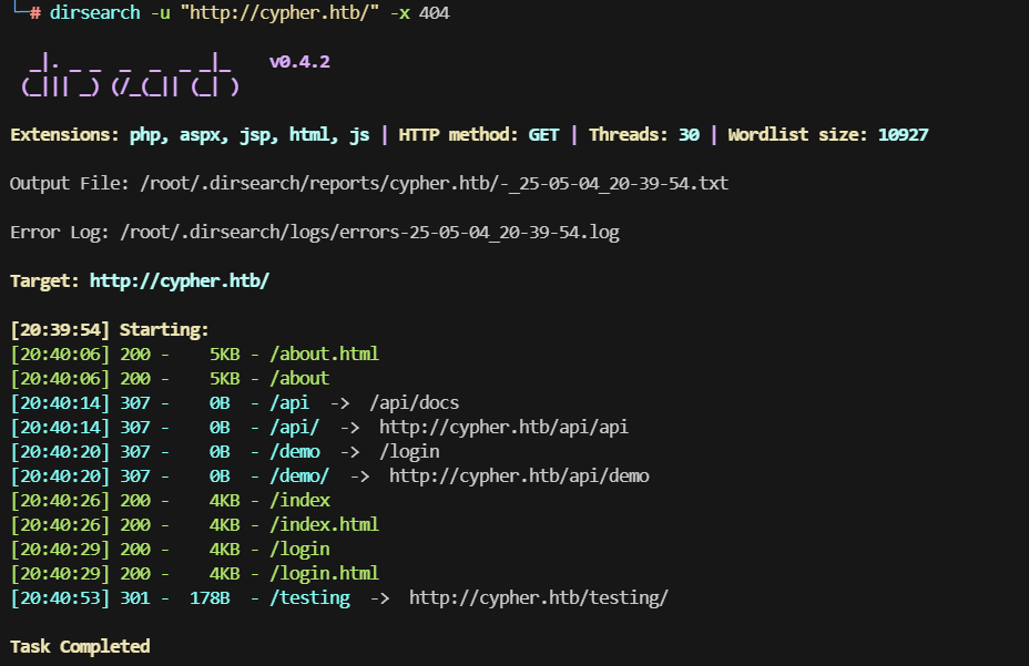 dirsearch -u "http://cypher.htb/" -x 404