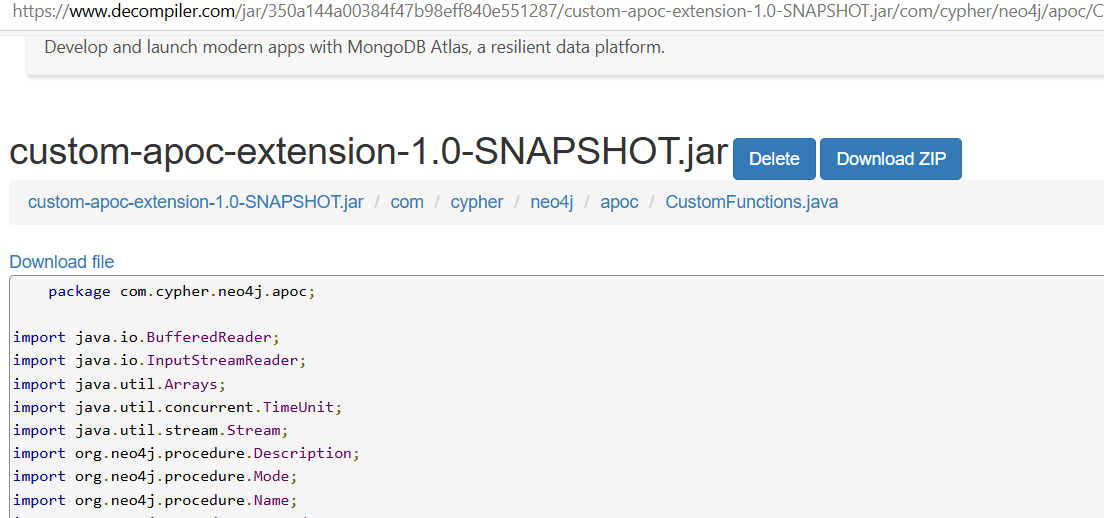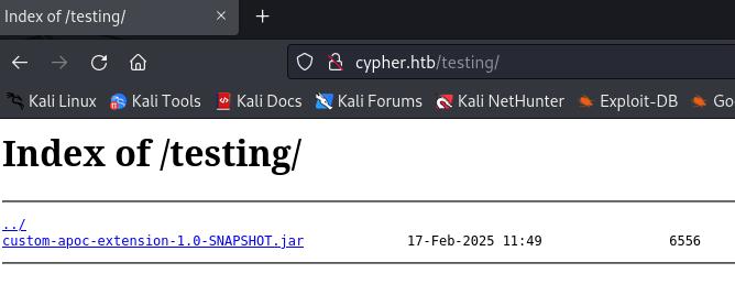 目录扫描的时候还有其他目录没尝试,访问http://cypher.htb/testing, 本机浏览器访问502 , 命令行curl倒是能正常访问,暂时不清楚原因,(后面发现,是同时开了tun隧道模式和系统daili,关闭系统daili即可,gpt说可能是因为同时开,浏览器的流量会被两种模式分别处理一遍,导致走错路由了,不太清楚)用kali的浏览器访问正常,然后下载文件看看