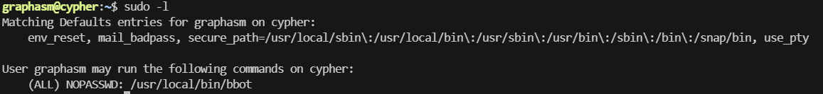 sudo -l,找到了/usr/local/bin/bbot,可以不需要输入root的密码直接执行,且执行权限是root