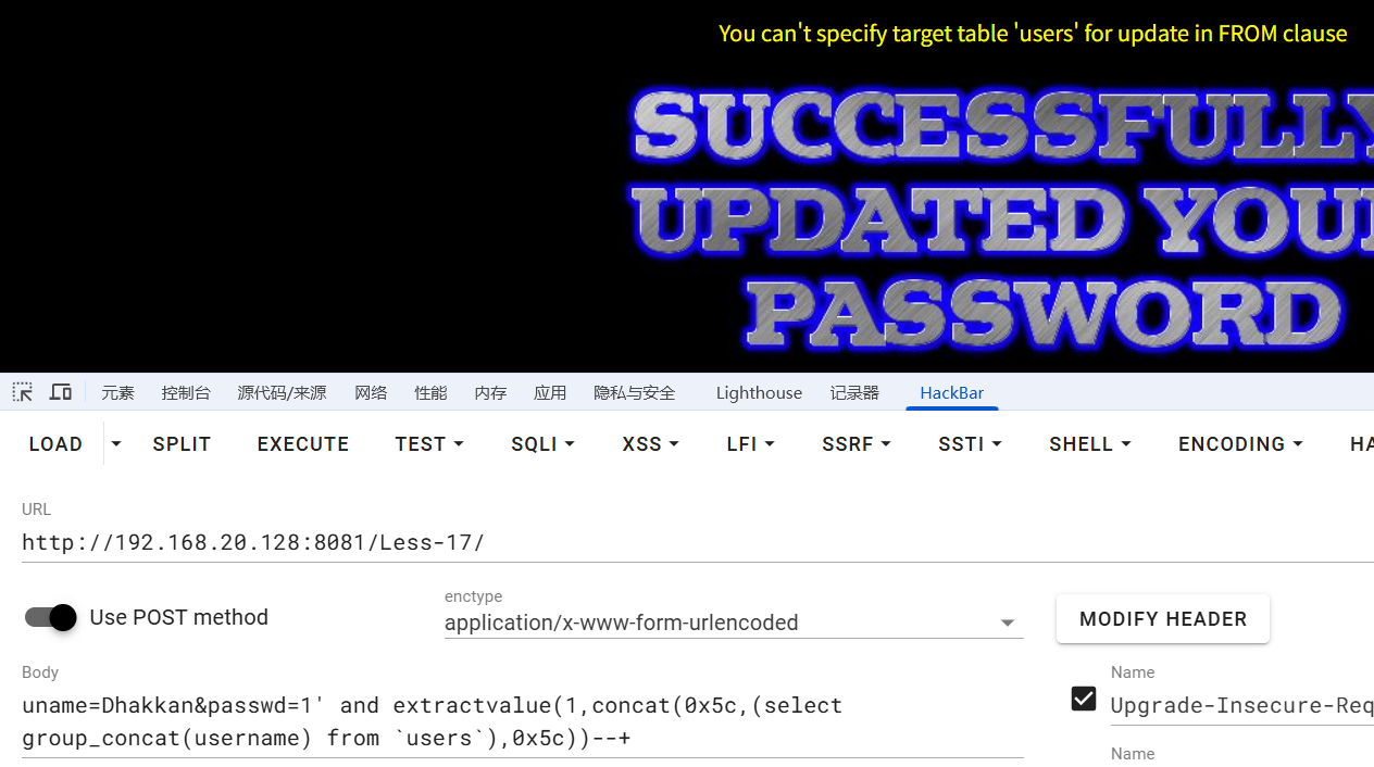 一开始在查字段的时候,有点问题,因为mysql不支持更新和查询是同一个表,可能是因为这是重置密码的功能,执行语句都会更新users表,对一个正在更新的表无法进行查询,通过创建一个临时表解决