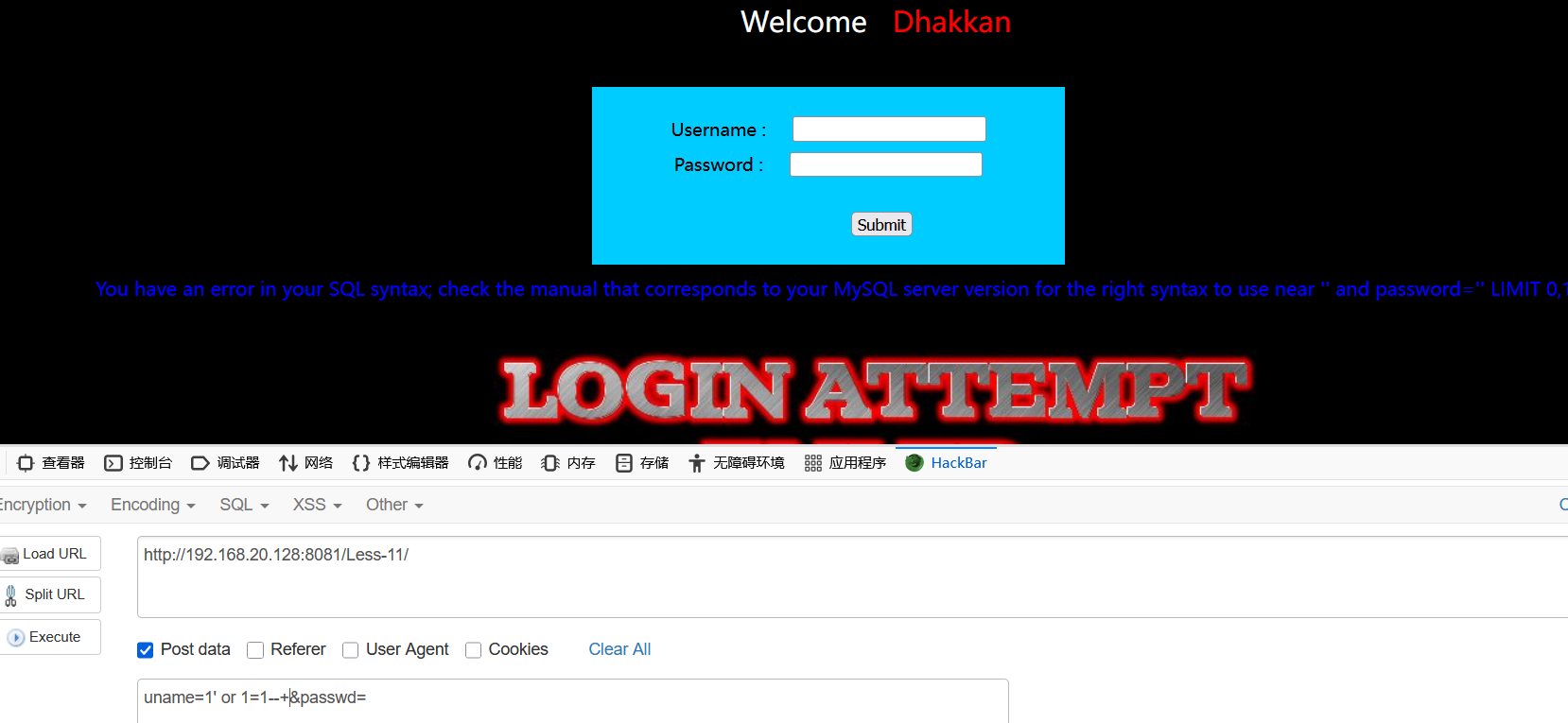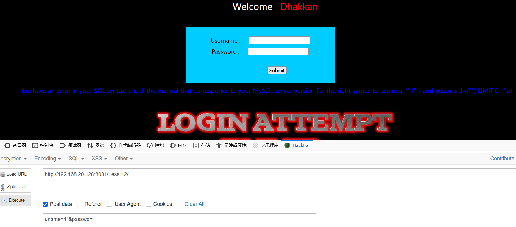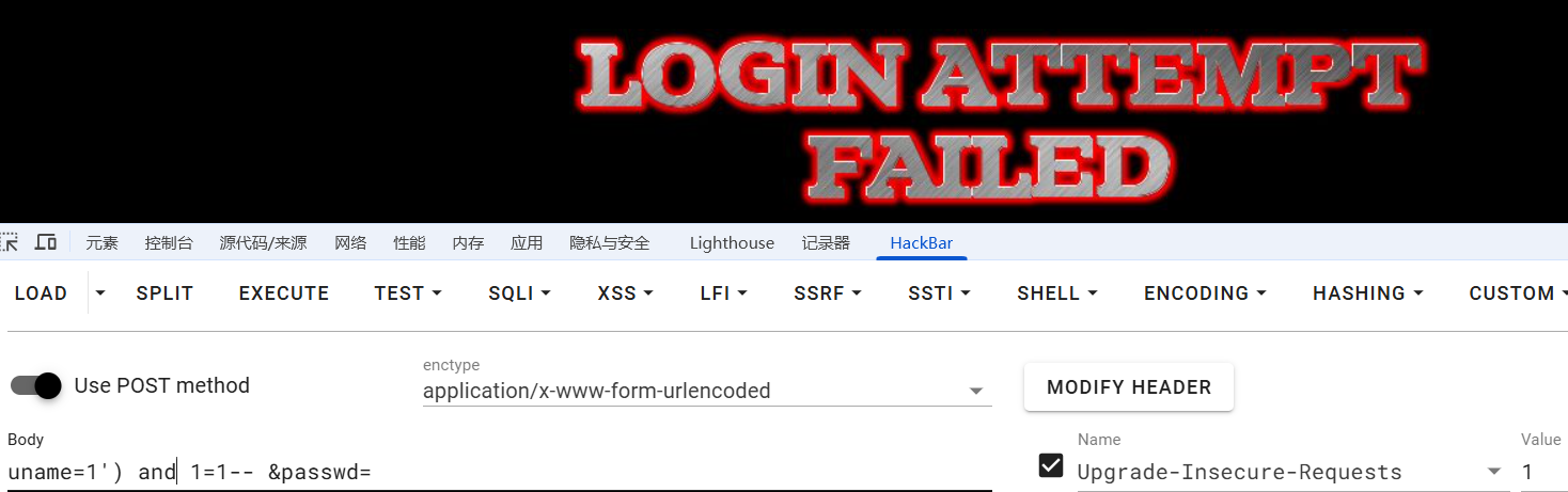 输入uname=1') and 1=1-- &passwd=,回显登录失败