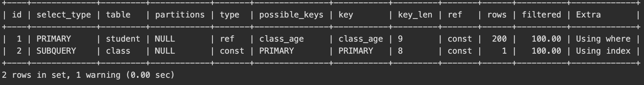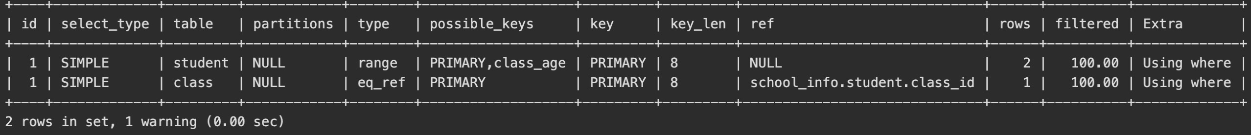 explain select * from student inner join class on class.id=student.class_id where student.id in(1,2);