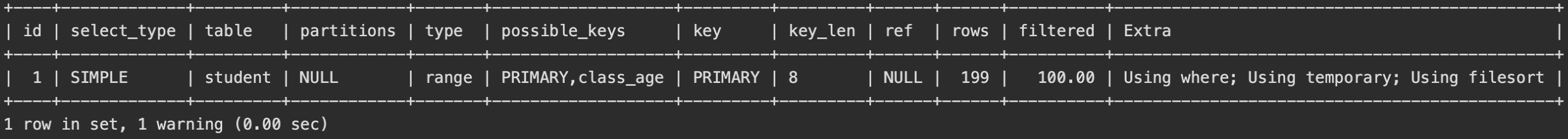 explain select count(*) from student where id<200 group by class_id order by class_id;