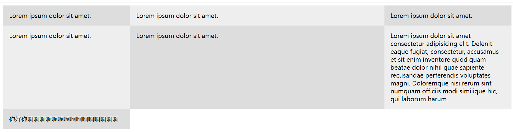 1 <style> 2 .wrapper { 3 display: grid; 4 grid-template-columns: 1fr 2fr 1fr; 5 } 6 .wrapper>div { 7 background: #eee; 8 padding: 1rem; 9 } 10 .wrapper>div:nth-child(odd) { 11 background: #ddd; 12 } 13 </style> 14 <body> 15 <div class="wrapper"> 16 <div>Lorem ipsum dolor sit amet.</div> 17 <div>Lorem ipsum dolor sit amet.</div> 18 <div>Lorem ipsum dolor sit amet.</div> 19 <div>Lorem ipsum dolor sit amet.</div> 20 <div>Lorem ipsum dolor sit amet.</div> 21 <div>Lorem ipsum dolor sit amet consectetur adipisicing elit. Deleniti eaque fugiat, consectetur, accusamus et 22 sit enim inventore quod quam beatae dolor nihil quae sapiente recusandae perferendis voluptates magni. 23 Doloremque nisi rerum sint numquam officiis modi similique hic, qui laborum harum.</div> 24 <div>你好你啊啊啊啊啊啊啊啊啊啊啊啊啊啊啊</div> 25 </div> 26 </body>