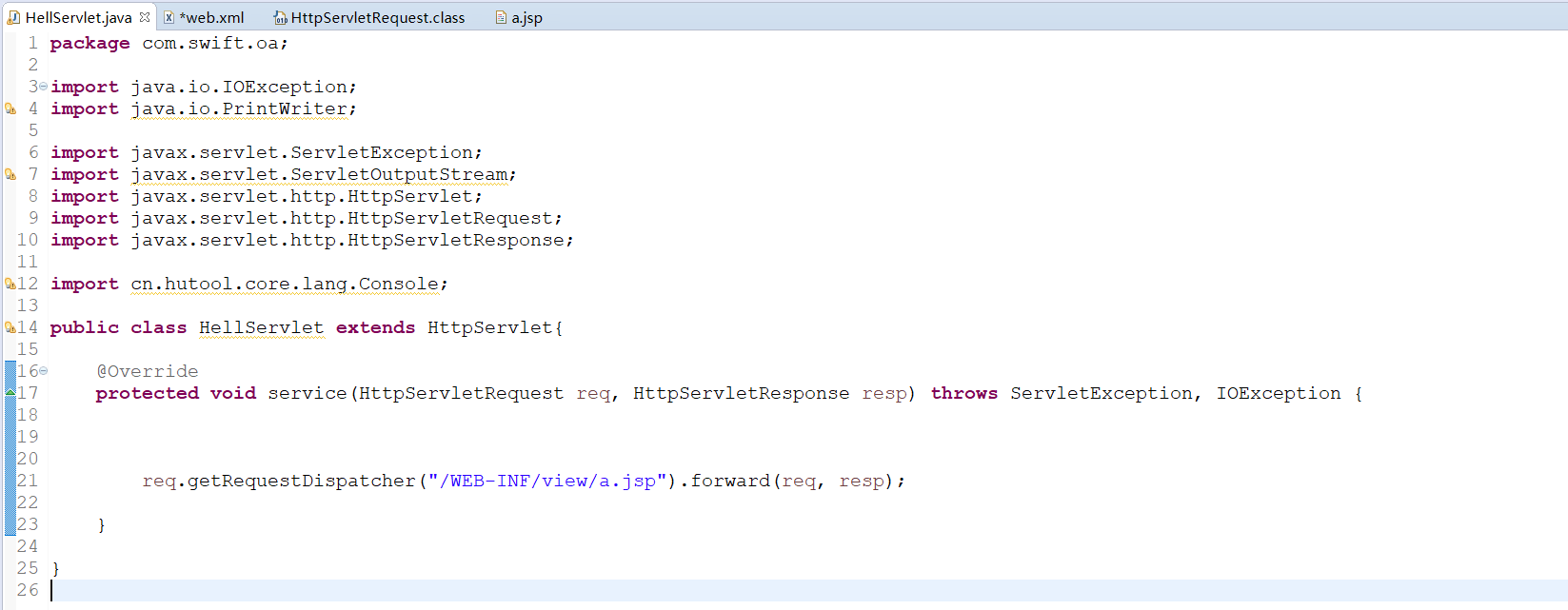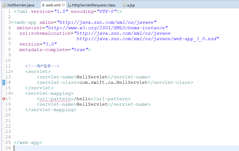 <?xml version="1.0" encoding="UTF-8"?> <web-app xmlns="http://java.sun.com/xml/ns/javaee" xmlns:xsi="http://www.w3.org/2001/XMLSchema-instance" xsi:schemaLocation="http://java.sun.com/xml/ns/javaee http://java.sun.com/xml/ns/javaee/web-app_3_0.xsd" version="3.0" metadata-complete="true"> <!--用户登录--> <servlet> <servlet-name>HellServlet</servlet-name> <servlet-class>com.swift.oa.HellServlet</servlet-class> </servlet> <servlet-mapping> <url-pattern>/hello</url-pattern> <servlet-name>HellServlet</servlet-name> </servlet-mapping> </web-app>