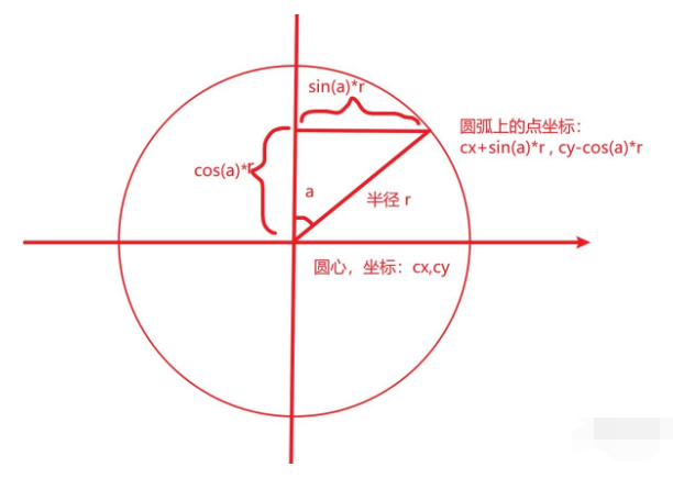 1 function execPoint(cx, cy, r, ratio) { 2 // 计算弧度,一个整圆弧度是 2π 3 const rad = ratio* 2 * Math.PI 4 return { 5 x: cx + Math.sin(rad) * r, 6 y: cy - Math.cos(rad) * r 7 } 8 }