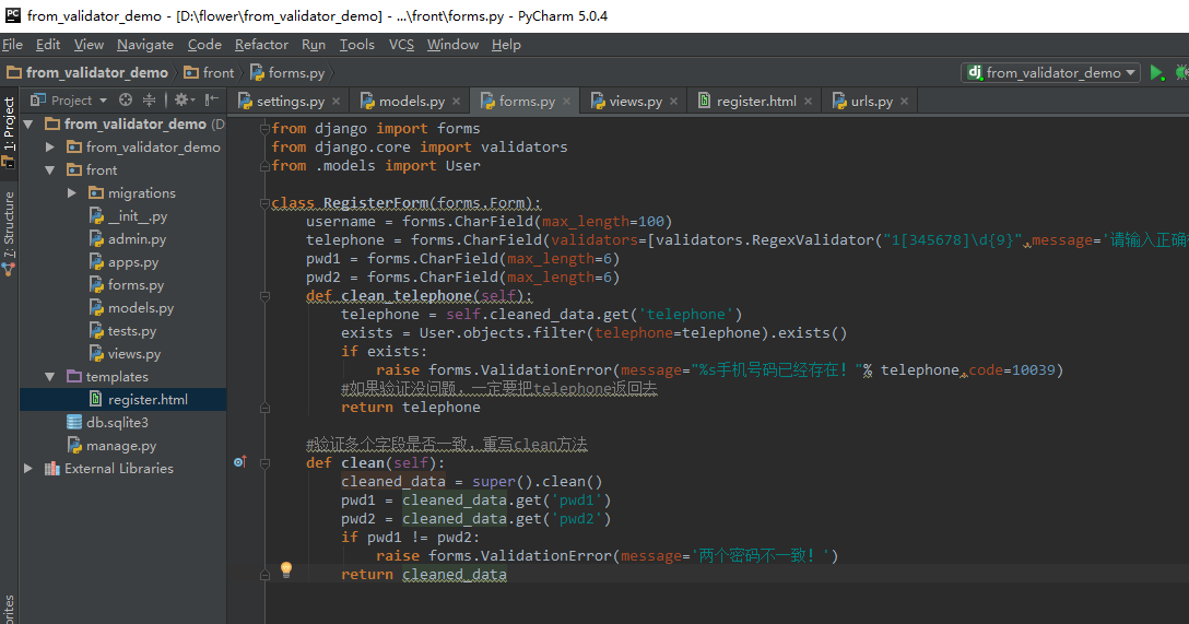 class MyForm(forms.Form): telephone = forms.CharField(validators=[validators.RegexValidator("1[345678]\d{9}",message='请输入正确格式的手机号码!')]) pwd1 = forms.CharField(max_length=12) pwd2 = forms.CharField(max_length=12) def clean(self): cleaned_data = super().clean() pwd1 = cleaned_data.get('pwd1') pwd2 = cleaned_data.get('pwd2') if pwd1 != pwd2: raise forms.ValidationError('两个密码不一致!')