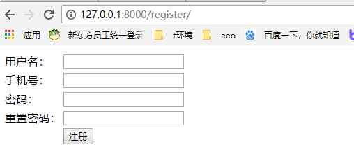 <!DOCTYPE html> <html lang="en"> <head> <meta charset="UTF-8"> <title>注册</title> </head> <body> <form action="" method="post"> <table> <tr> <td>用户名:</td> <td><input type="text" name="username"></td> </tr> <tr> <td>手机号:</td> <td><input type="text" name="telephone"></td> </tr> <tr> <td>密码:</td> <td><input type="password" name="pwd1"></td> </tr> <tr> <td>重置密码:</td> <td><input type="password" name="pwd2"></td> </tr> <tr> <td></td> <td><input type="submit" value="注册"></td> </tr> </table> </form> </body> </html>