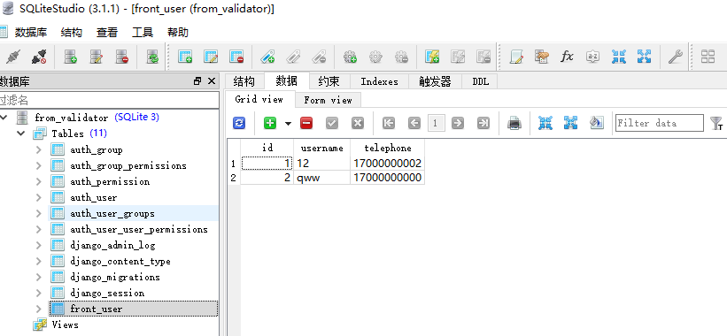MaxValueValidator:验证最大值。MinValueValidator:验证最小值。MinLengthValidator:验证最小长度。MaxLengthValidator:验证最大长度。EmailValidator:验证是否是邮箱格式。URLValidator:验证是否是URL格式。RegexValidator:如果还需要更加复杂的验证,那么我们可以通过正则表达式的验证器:RegexValidator。比如现在要验证手机号码是否合格,那么我们可以通过以下代码实现: