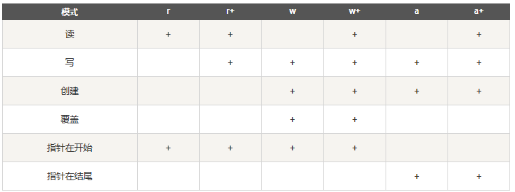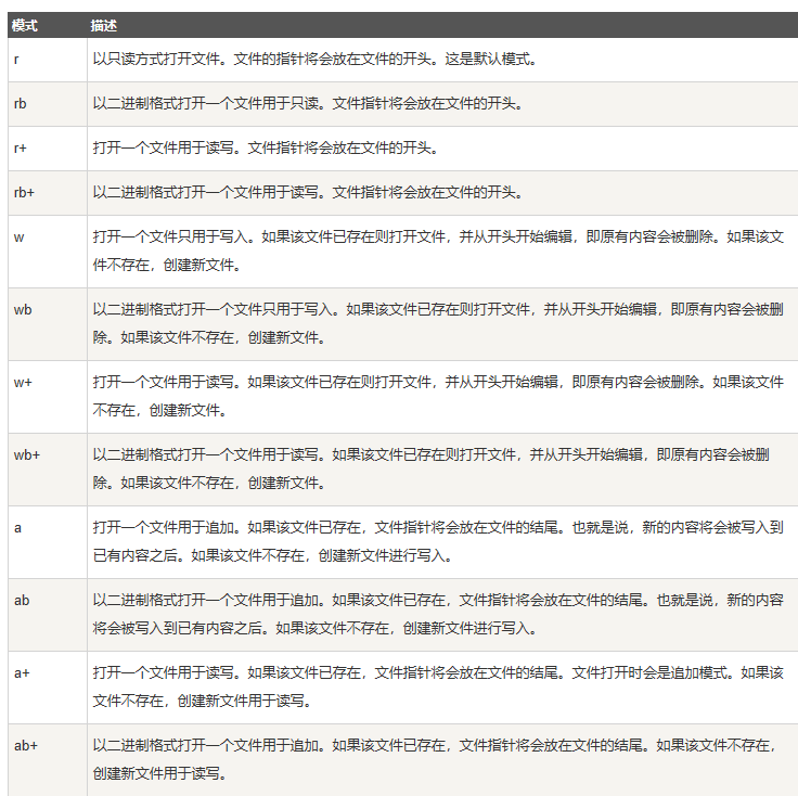 #1. 打开文件的模式有(默认为文本模式): r ,只读模式【默认模式,文件必须存在,不存在则抛出异常】 w,只写模式【不可读;不存在则创建;存在则清空内容】 a, 只追加写模式【不可读;不存在则创建;存在则只追加内容】 #2. 对于非文本文件,我们只能使用b模式,"b"表示以字节的方式操作(而所有文件也都是以字节的形式存储的,使用这种模式无需考虑文本文件的字符编码、图片文件的jgp格式、视频文件的avi格式) rb wb ab 注:以b方式打开时,读取到的内容是字节类型,写入时也需要提供字节类型,不能指定编码 #3,‘+’模式(就是增加了一个功能) r+, 读写【可读,可写】 w+,写读【可写,可读】 a+, 写读【可写,可读】 #4,以bytes类型操作的读写,写读,写读模式 r+b, 读写【可读,可写】 w+b,写读【可写,可读】 a+b, 写读【可写,可读】