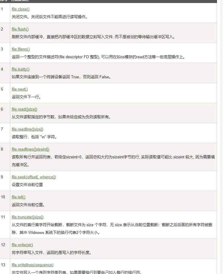 close() :使用 open() 方法一定要保证关闭文件对象,即调用 close() 方法。