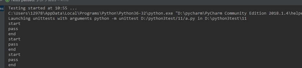 import unittest class TestMethod(unittest.TestCase): @classmethod def setUpClass(cls): print("开始前执行一次---->setUpClass") @classmethod def tearDownClass(cls): print("结束后执行一次---->tearDownClass") def setUp(self): print("每个方法执行前执行----->setup") def tearDown(self): print("每个方法执行前执行----->teardown") def test_01(self): print("case----->01") def test_02(self): print("case----->02") if __name__=='__main__': unittest.main()