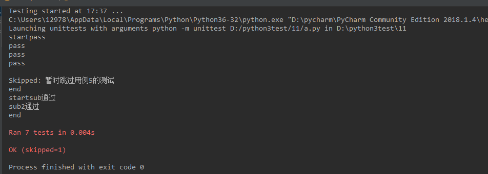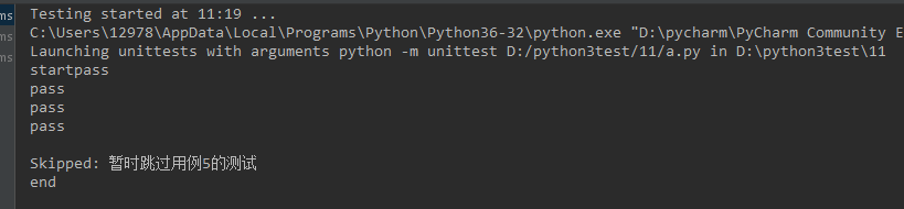 5.unittest.skip():装饰器,当运行用例时,有些用例可能不想执行等,可用装饰器暂时屏蔽该条测试用例。一种常见的用法就是比如说想调试某一个测试用例,想先屏蔽其他用例就可以用装饰器屏蔽。