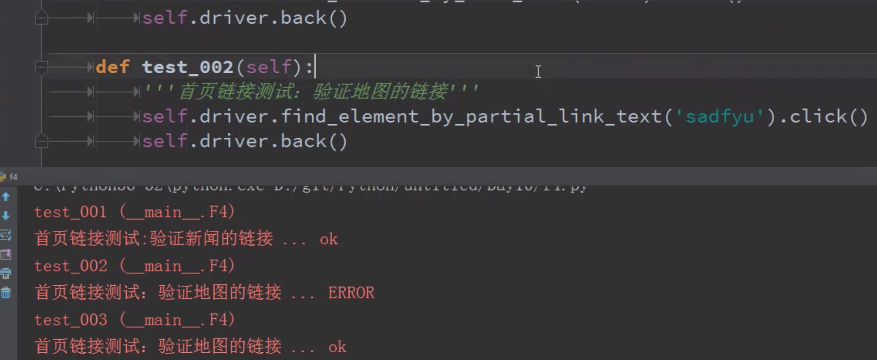 if __name__=='__main__': unittest.main(verbosity=1) #默认1 #0代表得到执行的测试总数和全局结果 #1代表得到成功的显示,失败的显示f,错误的显示e #2可以得到详细的信息
