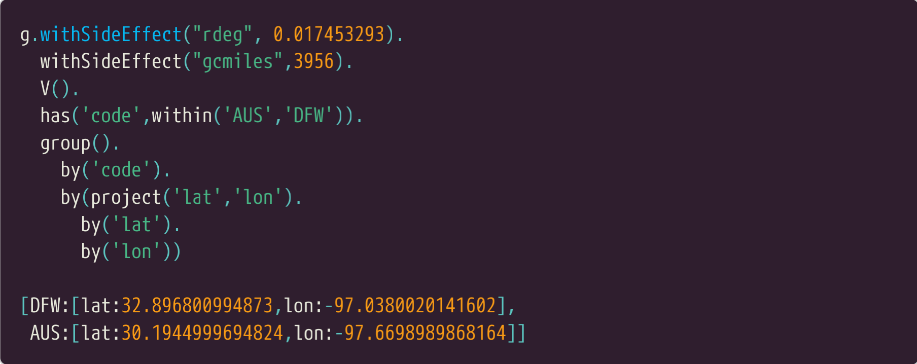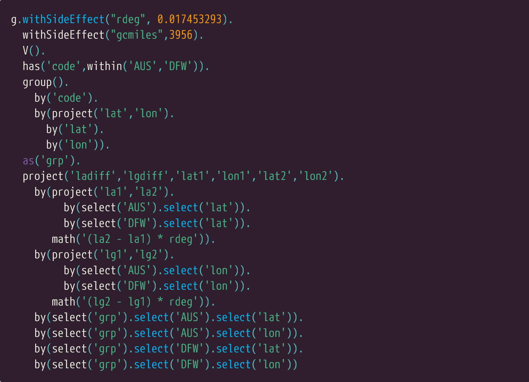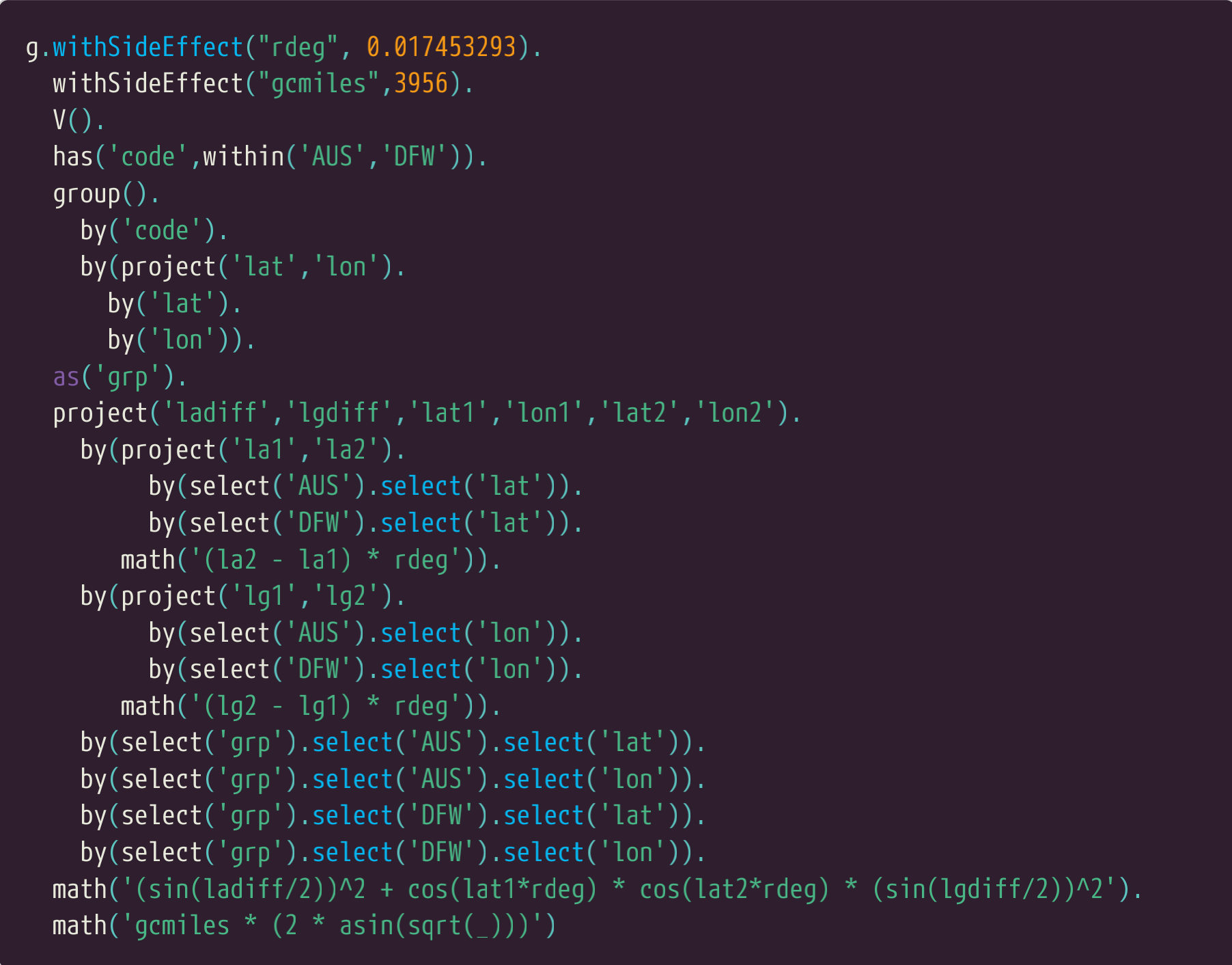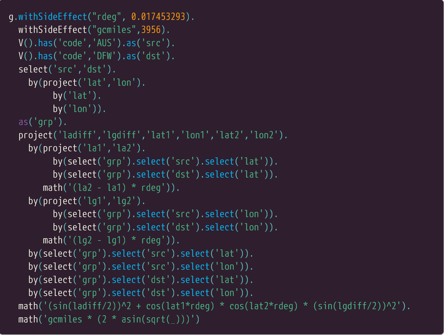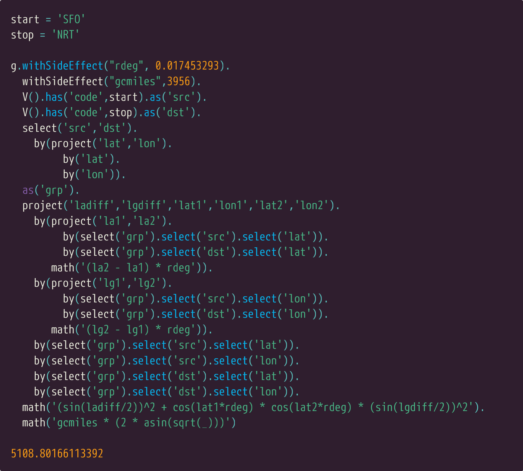 query that computes Great Circle distances all in Gremlin. The airport codes are embedded in the