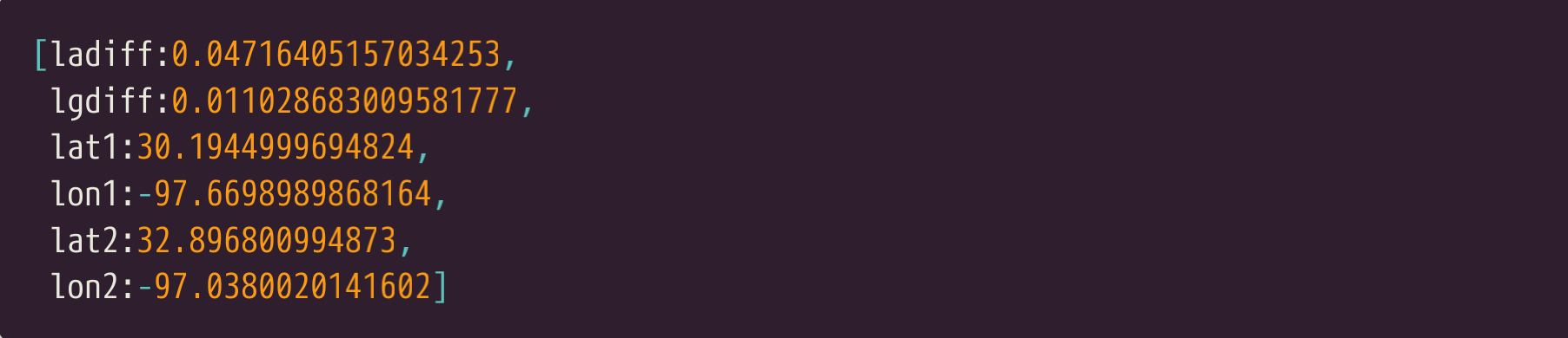 of the two coordinates. The next part of the query does that. A project step project('ladiff,lgdiff,lat1