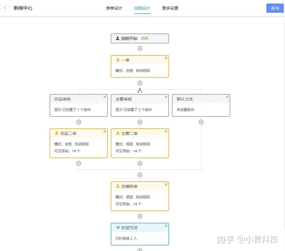 表单支持可视化工作流配置,采用 PageAdmin 自研的工作流组件,支持多条件组,支持办理和抄送节点,支持会签,或签和依次审批三种模式,可视化界面,对新手友好,普通业务人员直接可以通过可视化创建流程。