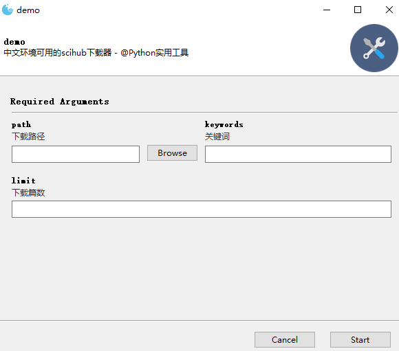 #!\Users\Local\Programs\Python37 # -*- coding: utf-8 -*- """ Gooey项目支持用一行代码将(几乎)任何Python 2或3控制台程序转换为GUI应用程序 1 安装:pip install Gooey 2 使用各种widget组件,逻辑编写 3 打包 """ import asyncio from scihub import SciHub from gooey import Gooey, GooeyParser def search(keywords: str, limit: int, path: str): """ 搜索相关论文并下载 Args: keywords (str): 关键词 limit (int): 篇数 path (str): 下载路径 """ pass # sh = SciHub() # result = sh.search(keywords, limit=limit) # print(result) # # loop = asyncio.get_event_loop() # # 获取所有需要下载的scihub直链 # tasks = [sh.async_get_direct_url(paper["url"]) for paper in result.get("papers", [])] # all_direct_urls = loop.run_until_complete(asyncio.gather(*tasks)) # print(all_direct_urls) # # # 下载所有论文 # loop.run_until_complete(sh.async_download(loop, all_direct_urls, path=path)) # loop.close() @Gooey def main(): """ #如果无widget参数,默认文本输入框,help--于提醒用户该选择器的作用 #支持的widget组件 1.勾选框 widget="CheckBox" 2.下拉框 widget="DropDown" 3.互斥选择框 widget="RadioGroup" 4.各种目标类型的选择框 文件选择框 widget="FileChooser" 目录选择框 widget="DirChooser" 多文件选择框 widget="MultiFileChooser" 文件保存目录 widget="FileSaver" 5.日期/时间选择器 widget="DateChooser/TimeChooser" 6.密码输入框 wiget="PasswordField" 7.多选列表框 widget="Listbox" 8.颜色选择器 widget="ColourChooser" 9.可过滤的下拉框 widget="FilterableDropdown" 10.滑片 widget="Slider" """ parser = GooeyParser(description="中文环境可用的scihub下载器 - @Python实用宝典") parser.add_argument('path', help="下载路径", widget="DirChooser") parser.add_argument('keywords', help="关键词") parser.add_argument('limit', help="下载篇数") args = parser.parse_args() #将用户输入的所有文本转化为对应对象的变量值,args.var 可提取对应的变量值 search(args.keywords, int(args.limit), args.path) print("下载成功了!!") main()