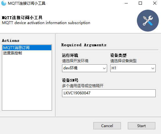 from gooey import Gooey, GooeyParser @Gooey( richtext_controls=True, # 打开终端对颜色支持 program_name="MQTT连接订阅小工具", # 程序名称 encoding="utf-8", # 设置编码格式,打包的时候遇到问题 progress_regex=r"^progress: (\d+)%$" # 正则,用于模式化运行时进度信息 ) def main(): settings_msg = 'MQTT device activation information subscription' parser = GooeyParser(description=settings_msg) subs = parser.add_subparsers(help='commands', dest='command') my_parser = subs.add_parser('MQTT消息订阅') my_parser.add_argument("connect", metavar='运行环境',help="请选择开发环境",choices=['dev环境','staging环境'], default='dev环境') my_parser.add_argument("device_type",metavar='设备类型',help="请选择设备类型",choices=['H1','H3'],default='H1') my_parser.add_argument("serialNumber", metavar='设备SN号',default='LKVC19060047',help='多个请用逗号或空格隔开') siege_parser = subs.add_parser('进度条控制') siege_parser.add_argument('num',help='请输入数字',default=100) args = parser.parse_args() print(args, flush=True) # flush=True在打包的时候会用到 if __name__ == '__main__': main()